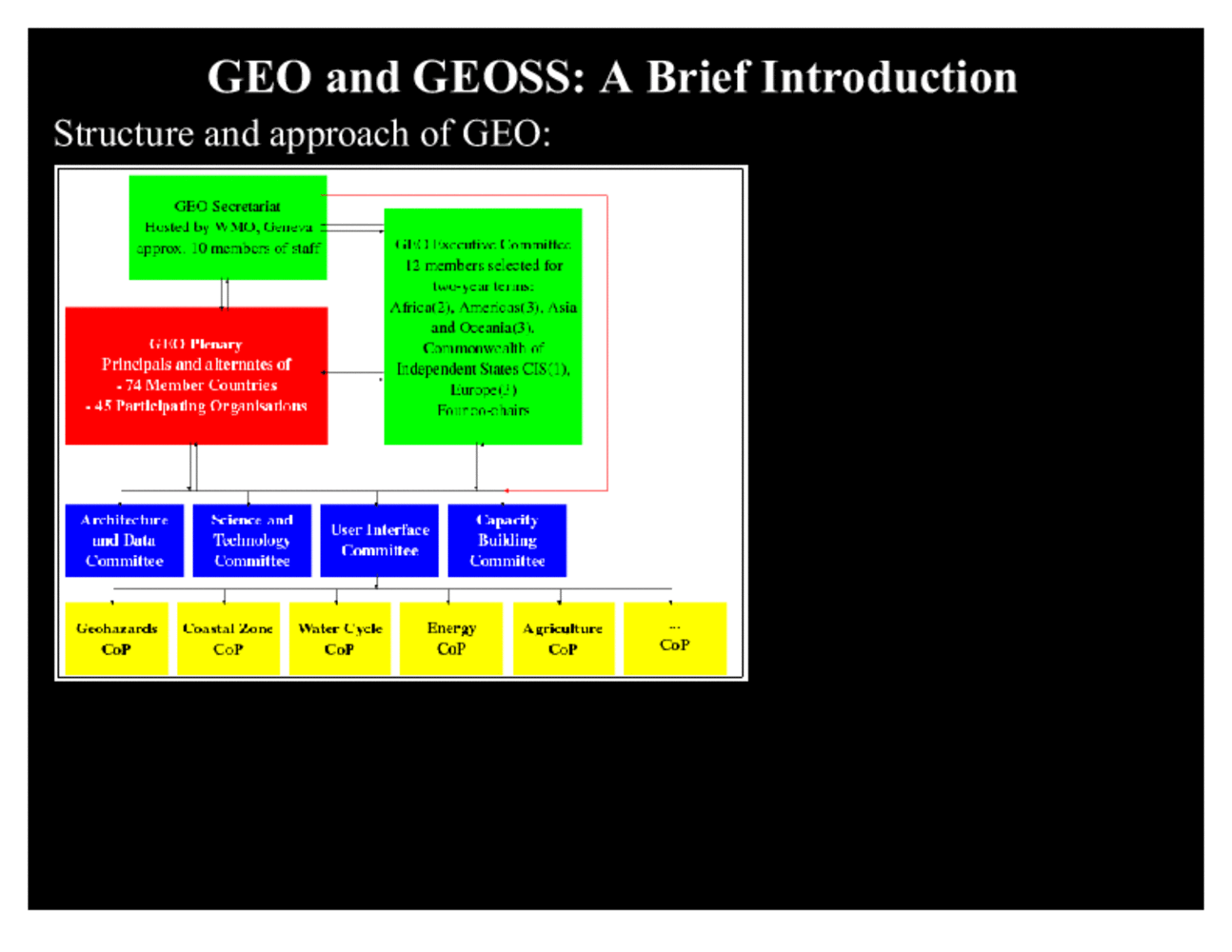 The organizational structure of GEO includes the Plenary as the main decision making component, where each Member Country has a voice. The Participating Organizations are also represented in the Plenary and have the right to speak there. The Executive Committee has twelve members representing the different geographical regions. The GEO Secretariat is responsible for the day-to-day operations and is supposed to support the Plenary, the Executive Committee and the other GEO Committees in their work. Currently, GEO has four Committees that carry out a major part of the work, namely, the User Interface Committee (UIC), the Science and Technology Committee (STC), the Architecture and Data Committee (ADC), and the Capacity Building Committee (CBC). Under the UIC, a number of so-called Communities of Practice (CoPs) have been identified or established. Most of the CoP derived from existing IGOS Theme teams, but some CoP such as the ones on Forests and Energy aggregated newly under the UIC. |