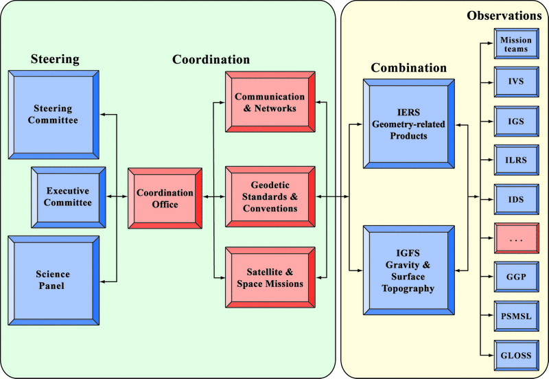 Future organization of GGOS. Proposed structure for the future GGOS. Lines and arrows indicate information flow and do not imply any hierarchical relations. Existing entities are indicated in blue, new entities to be established in red. GGOS is currently in the process of established these new entities. |