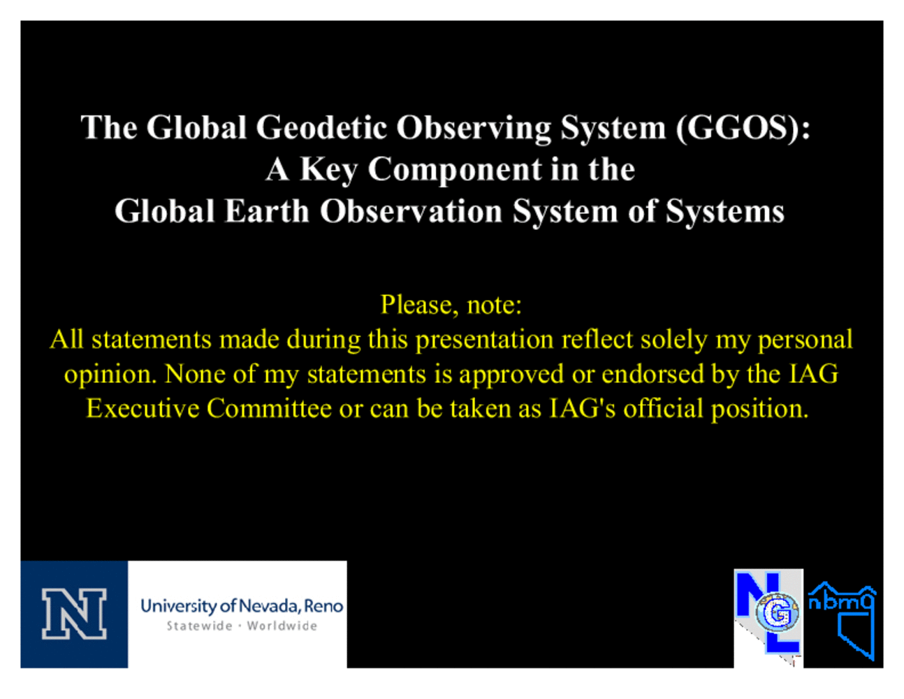 It has to be mentioned that the contents of this presentation mainly reflects the personal opinion of the author. None of the slides or comments has been reviewed by the GGOS Science Panel or endoresed by the GGOS Steering Committee or IAG Executive Committee. |