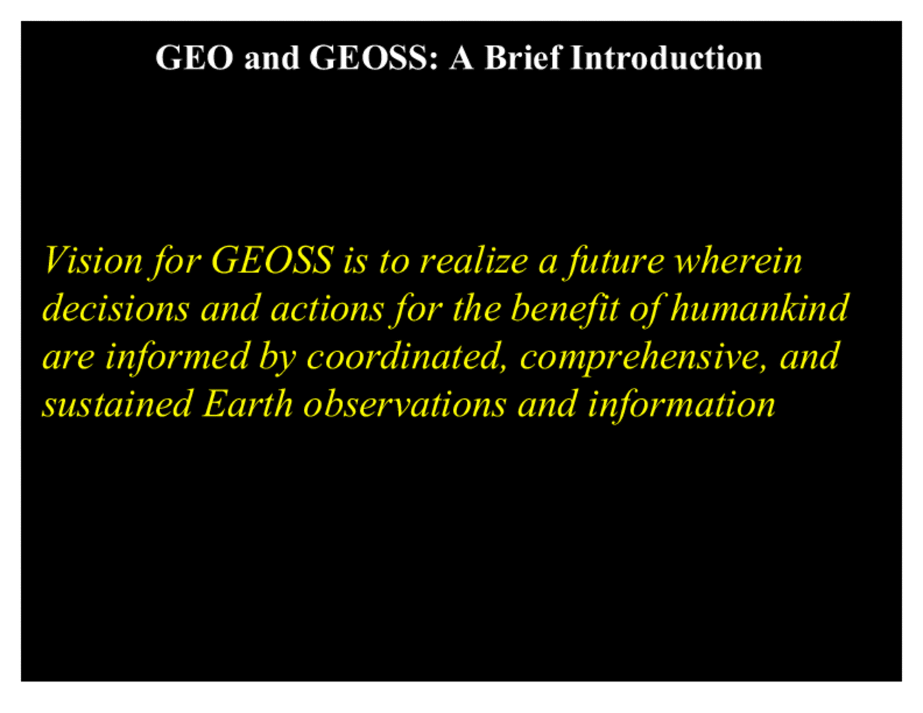 The vision of GEO is motivated by the original starting point, i.e., the World Summit on Sustainable Development, where the crucial role of Earth observations for informed decision making was emphasized. |
