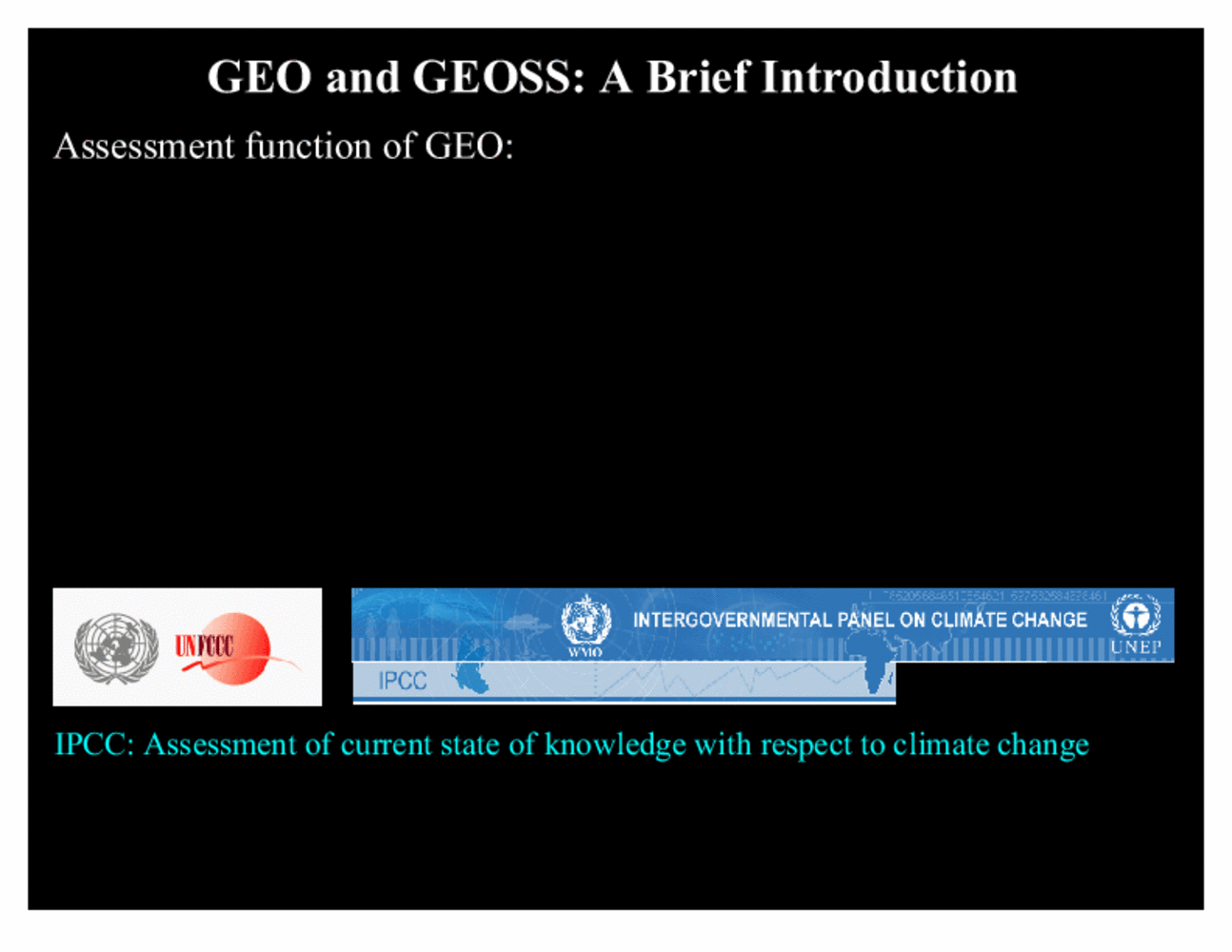 Implementing a GEOSS implicitly requires also an assessment of the current situation. We all are accustomed to the assessments of the state of scientific knowledge with respect to climate change and its causes provided frequently by the IPCC. Up to now, no similar assessment process is established for the state of Earth observations, although it would be very important to have. |