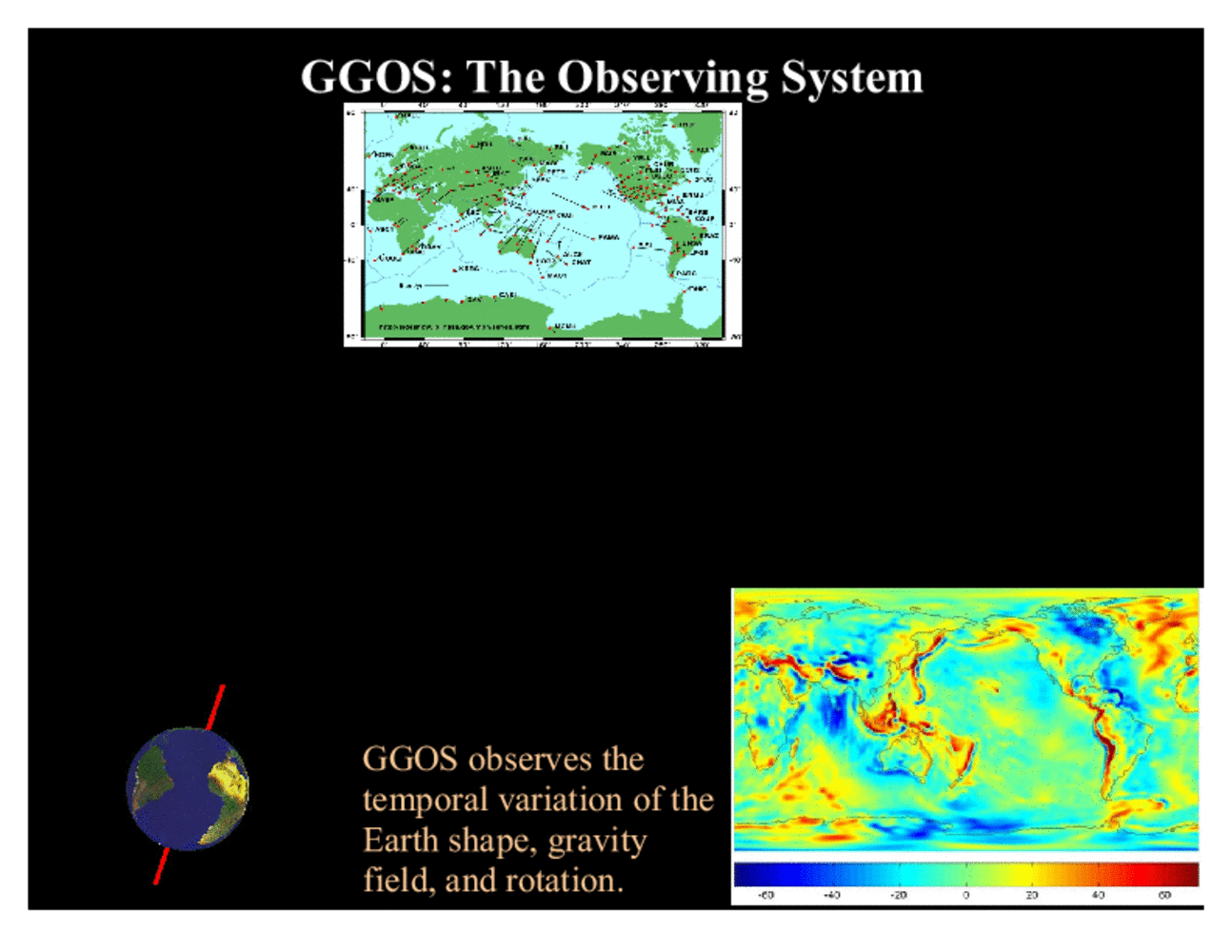GGOS as an observing system aims to provide consistent observations of the spatial and temporal changes of the shape and gravitational field of the Earth, as well as the temporal variations of the Earth's rotation. In other words, it aims to deliver a global picture of the surface kinematics of our planet, including the ocean, ice cover and land surfaces. In addition, it aims to deliver estimates of mass anomalies, mass transport and mass exchange in the Earth system. Surface kinematics and mass transport together are the key to global mass balance determination, and an important contribution to the understanding of the energy budget of our planet. Moreover, the system aims to provide the observations that are needed to determine and maintain a terrestrial reference frame of higher accuracy and greater temporal stability than what is available today. By combining the "three pillars" into one observing system having utmost accuracy and operating in a well-defined and reproducible global terrestrial frame, GGOS adds to these pillars a new quality and dimension in the context of Earth system research. The observing system, in order to meet its objectives, has to combine the highest measurement precision with spatial and temporal consistency and stability that is maintained over decades. |