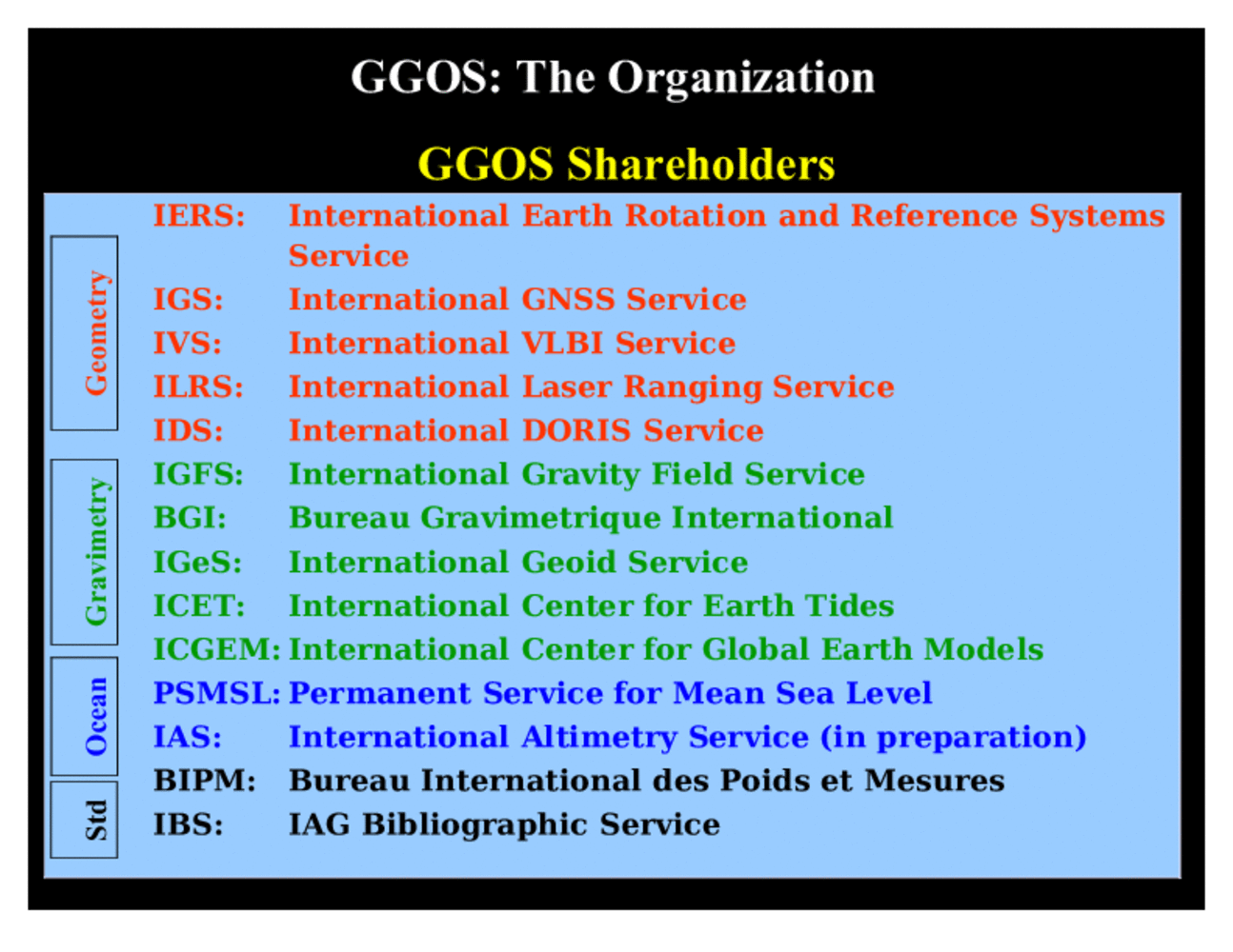 GGOS as an organization can be considered as an umbrella for the IAG Services and the Commissions. In a sense, these components of IAG can be considered to be the main shareholders of GGOS. The most important services include those for geometry, the gravity field, and the ocean and ice sheets. In addition, there are services for standards. GGOS adds a strong and unique voice to these components that helps to coordinate the IAG work internally and represent is through a unique interface to the outside world. The observational work, data analysis and production of products is, however, preformed by the Services. This is also illustrated in the next slide. |