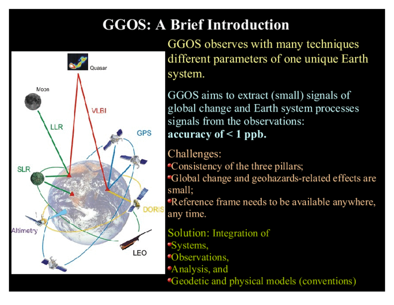 As we already saw, GGOS utilizes a number of techniques that are all linked together through the fact that they observe different overlapping parts of the a unique object, that is the Earth system. A main goal of GGOS is to extract from these observations signals related to Earth system processes and global change. Because these signals are very small, the accuracy requirements for GGOS are demanding, and in many cases turn out to be less than 1 ppb. In achieving this accuracy, GGOS faces a number of challenges, including the consistency both within each of the three pillars but even more so across these pillars, and the stability and accuracy of the underlying combined geometric and gravimetric reference frame. The solution to these challenges as currently seen in GGOS is a better integration on several levels. Integration of the techniques to collocation and both on ground and in space will strengthen the techniques and help to identify individual technique-specific biases. Integration of observations from different techniques will help to overcome inherent limitations of techniques and exploit the 'one-object' concept. Integration of analysis will ensure that the analysis is consistent in terms of conventions and standards and also strengthen the analysis with respect to a broader observational basis. Finally, integration of the geodetic and geophysical models will allow us to take into account more of the interactions between the different processes in atmosphere, ocean and solid Earth, which impact geodetic observations at the target accuracy and can no longer be neglected. |