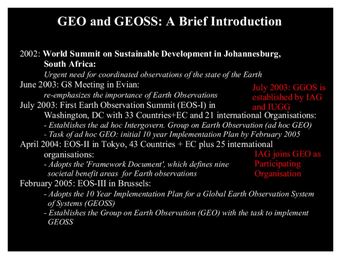 GGOS provides the metrological basis for Earth observations and it provides observations of important aspects of the Earth system, relevant to many societal areas. Therefore, GGOS is a key component for the Earth observation system. The World Summit on sustainable development emphasized the need for more and better coordinated Earth observations. Subsequently, the ad hoc Group on Earth Observations (GEO) was established by the G8 meeting with the task to prepare an implementation plan for the Global Earth Observation System of Systems (GEOSS). Three ministerial Earth Observation Summits (EOS) were held during the lifetime of this ad hoc GEO, and EOS-II identified nine Societal Benefit Areas (SBA) of Earth observations. The Implementation Plan for GEOSS, which accepted by EOS-III in 2005 is built around these nine SBAs, which include the broad areas of Climate, Weather, Health, Energy, Water, Disasters, Biodiversity, and Agriculture, Ecosystems. EOS-III also established GEO as a permanent organization. It is worthwhile to mention that GGOS was established at about the same time as the ad hoc GEO. IAG joint GEO as a Participating Organization at EOS-II, and IAG delegate its representation in GEO to GGOS. |