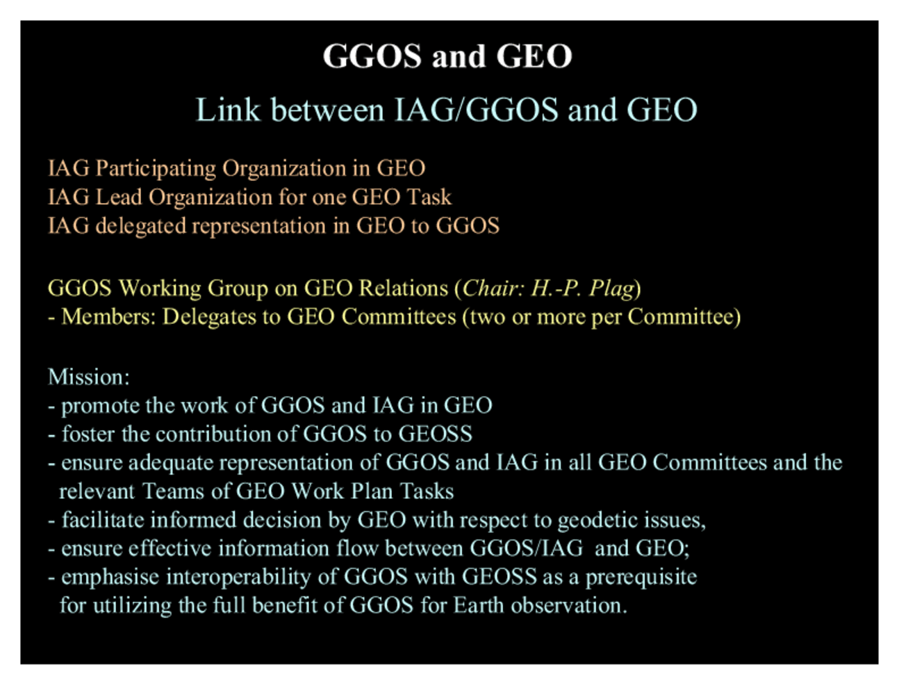 GGOS has represented IAG as Participating Organization in GEO since IAG joint GEO in 2004. Today, IAG is represented in most of the GEO Plenary meetings and the GEO Committees. Moreover, IAG is the lead organization for one of the Tasks of the GEO Work Plan. In order to coordinate the links between IAG/GGOS and GEO internally in GGOS, GGOS has established a Working Group on GEO Relations. Members of this WG are the IAG/GGOS delegates to the GEO Committees. The mission of the WG covers all aspects of the links between IAG/GGOS and GEO. The WG has the task to facilitate an effective geodetic support for GEO, the flow of information from GEO to IAG/GGOS and a satisfactory contribution of GGOS to GEOSS. |