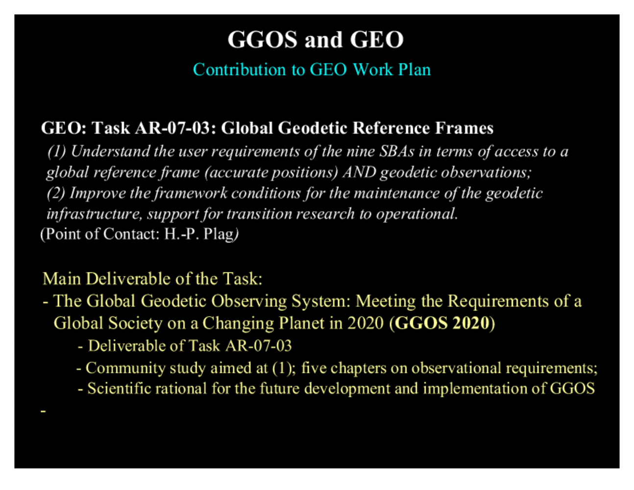 Of particular interest for the geodetic community is the GEO Task AR-07-03, which was proposed by IAG and is today led by IAG/GGOS. This task has two main objectives, namely, to link to users in the nine SBAs and to understand their requirements in terms of geodetic observations and products, and to leverage GEO as an intergovernmental organization for the promotion of GGOS and its products and eventually for the establishment of better and long-term support for the global geodetic infrastructure of GGOS. A main deliverable of this task is the GGOS 2020 book, which has been compiled over the last two years and is now in its final review. |