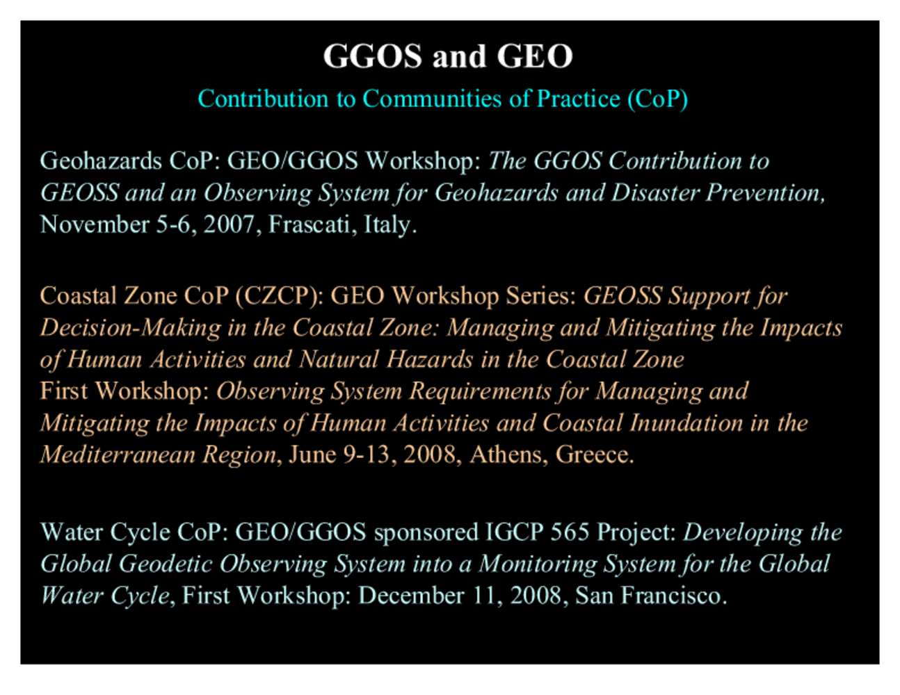 GGOS contributes to a number of GEO activities, in particular, some of the so-called Communities of Practice (CoP), which GEO has identified or established as its main interface to major user groups. Some of these CoPs developed out of Themes of the Integrated Global Observing Strategy-Partnership (IGOS-P), which has been terminated in May 2008 in the wake of the establishment of GEO. GGOS was a member of IGOS-P since 2006, and during this membership established relations to several of the Theme Teams, which now map into relationships to the corresponding CoPs. Examples of these links are a GEO workshop on geohazards, which was joint workshop organized by GEO, GGOS, and the Geohazards CoP. With the Coastal Zone CoP, GGOS is also contributing to a series of Workshops. GGOS also established a IGCP Project with the goal to strengthen the aspect of GGOS as an observing system for the global Water cycle, and this project is coordinated with GEO and the Water CoP. |