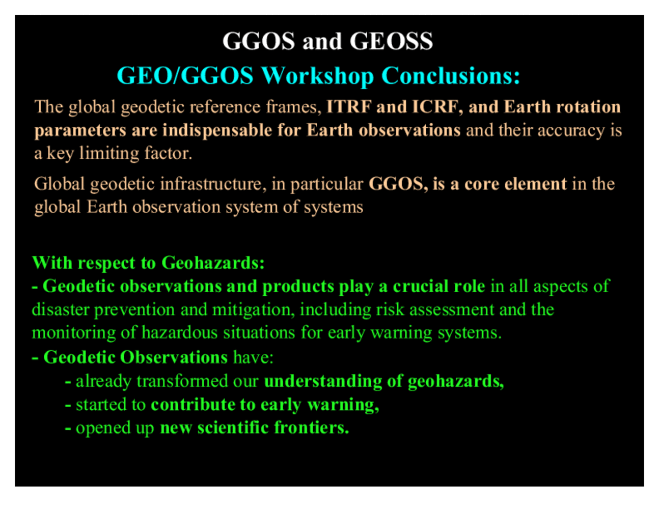 It is worthwhile to report some of the main conclusions of the Geohazards Workshop. A key point emphasized in many presentations, in particular those of the representatives of space agencies, was the fundamental role of the global geodetic reference frames for Earth observations. Despite the fact that these frames have today an unprecedented accuracy, the limiting factor for many applications still is the accuracy. The infrastructure necessary to maintain and improve the reference frame is considered to be part of the core infrastructure for Earth observations. With respect to geohazards, many presenters emphasized the transforming character of the geodetic techniques, and in particular of GNSS. The geodetic observations are recognized ad crucial for many geohazard-related applications, including hazard assessments, early warning, and basic research related to the processes that drive geohazards. The geodetic observations have already led to a much improved understanding of these processes and in several cases led to new discoveries. |
