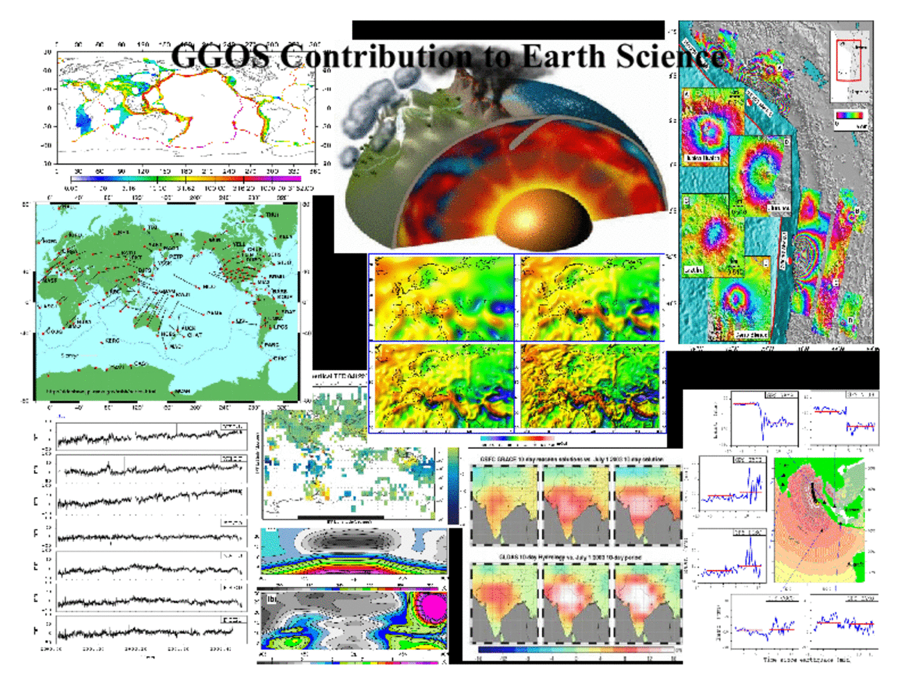 There is a wide range of contributions GGOS provides or supports in service of Earth science. The slide illustrates just a few examples. Almost all geodynamic processes are associated with changes in Earth's shape, gravity field and rotation. Consequently, geodetic observations provide the basis for ever improving understanding of these processes. The geodetic tracking networks provided novel measurements of Earth's surface kinematic, and they allowed the determination of a global strain map. Time series of point displacements derived from, in particular, GPS have revolutionized our understanding of how pre-, co- and postseismic deformation takes place. Geodetic imaging techniques provide a detailed picture of surface displacement and have greatly improved our understanding of the processes associated with volcanoes, earthquakes, landslides, and subsidence. Gravity satellite missions not only have resulted in orders-of-magnitude improvements of the gravity field model but also for the first time ever provided an integral picture of changes in land water at subcontinental scales. Geodetic sounding of atmosphere and ionosphere provides important observational input for meteorological models, and real-time determination of surface displacements during earthquakes have the potential to support early warning systems. |