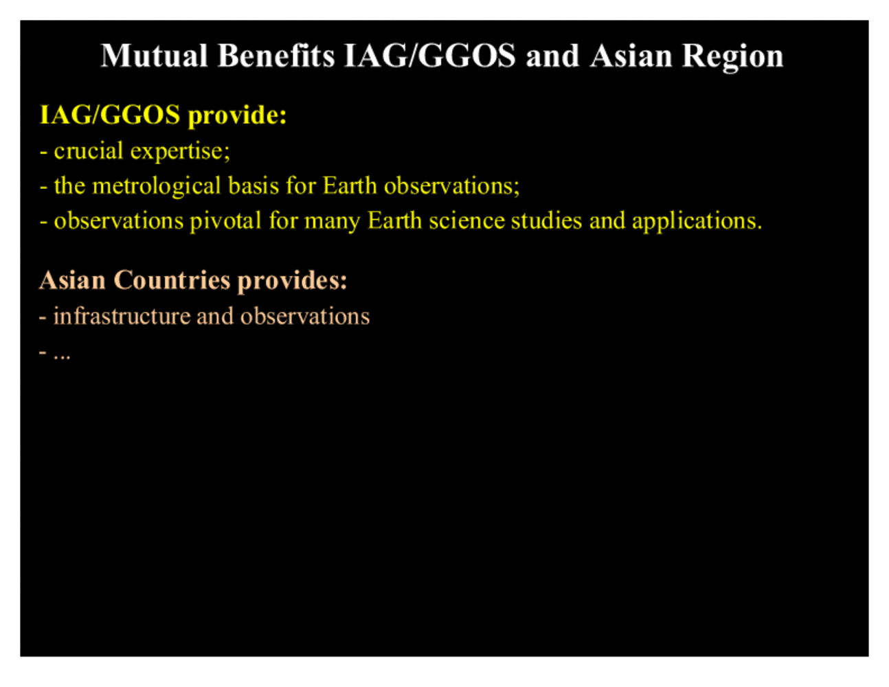 In summary, we can state that GGOS through the Science Panel, the IAG Services and Commissions provides geodetic expertise and can support many activities, also on regional level. GGOS as an observing system provides the metrological basis for most Earth observations and is a pivotal element of combined set of Earth observation systems. Moreover, the observations resulting from the three pillars of geodesy are valuable for a number of Earth science fields and contribute to a rapidly developing understanding of processes related to the dynamics of the Earth systems at various phenomea, including plate tectonics, geohazards, the global water cycle, sea level changes, and early warning. |